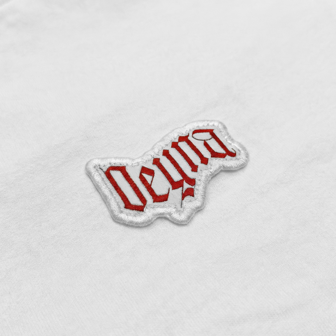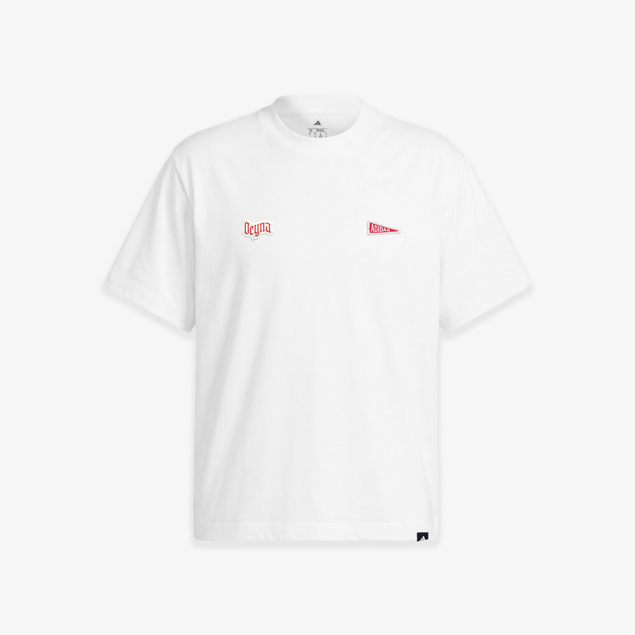 Przód koszulki to ukłon w stronę klasyki. Na lewej i prawej piersi znajdują się niewielkie, starannie wykonane naszywki. Jedna z napisem ‘Deyna’ w mocnym, stylizowanym piśmie, druga z logo adidas w formie proporczyka. Oba detale są w czerwieni i bieli, co mocno kontrastuje z czystym kolorem bluzy. To detale, które nadają koszulce unikalnego charakteru.