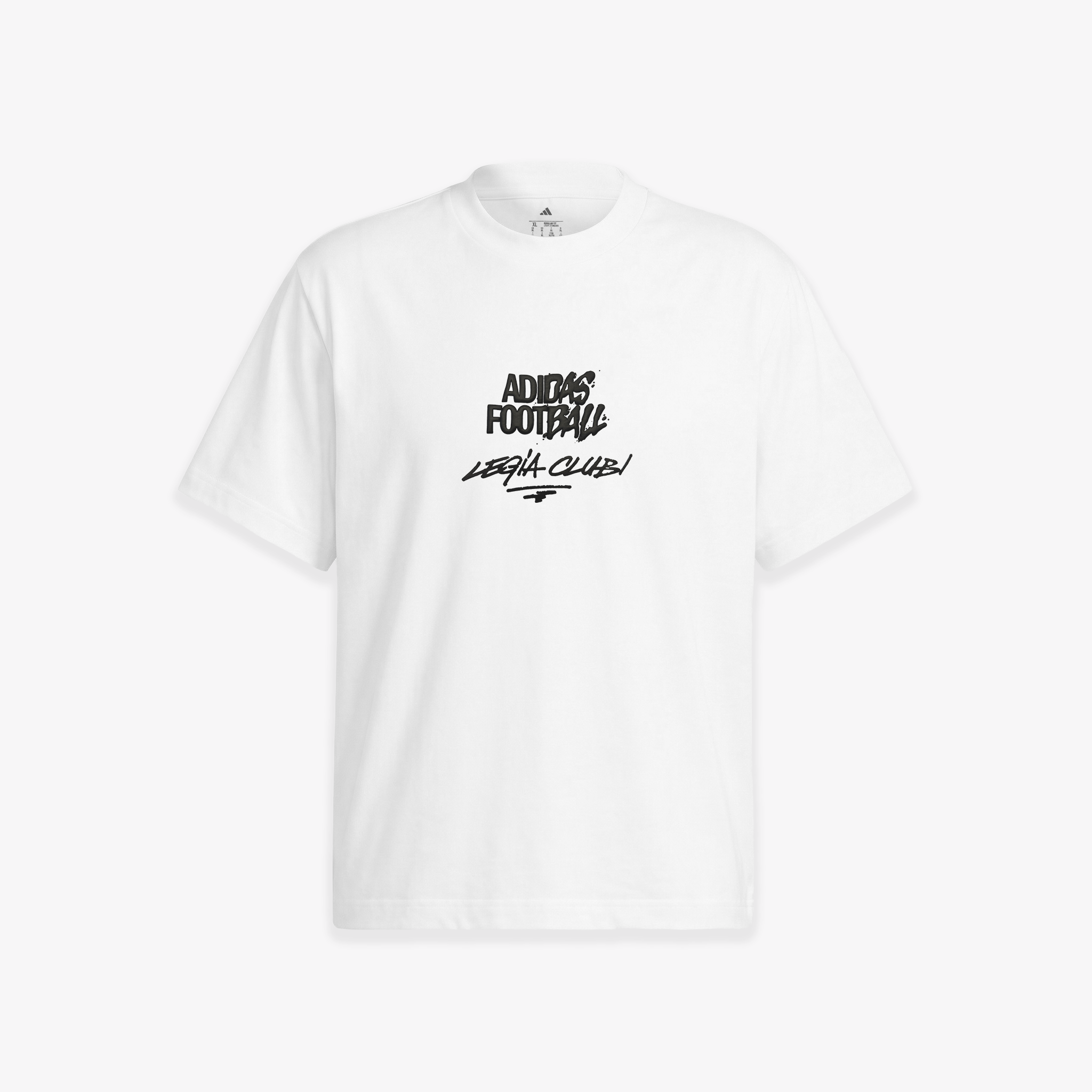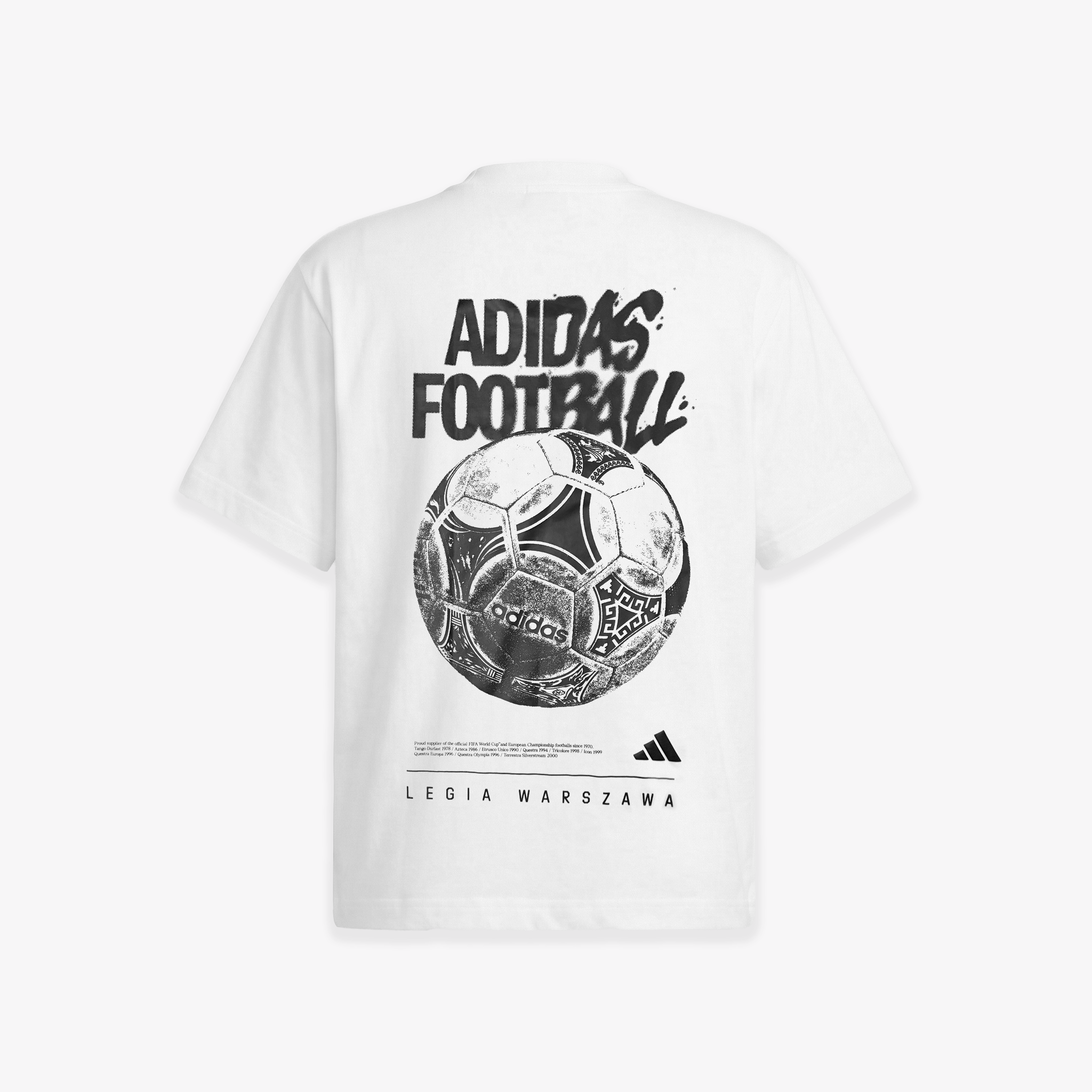W tym modelu grafika gra główną rolę. Z przodu znajdziesz stylizowane napisy „LEGIA CLUB” i „ADIDAS FOOTBALL” w stylu graffiti, a na plecach dużą piłkę retro. To nie jest płaski nadruk – wszystkie elementy są gumowane i wypukłe. Dzięki tej fakturze zyskujesz koszulkę, która ma niesamowitą głębię, a detale są wyczuwalne pod palcami, co potwierdza wysoką klasę produktu.
