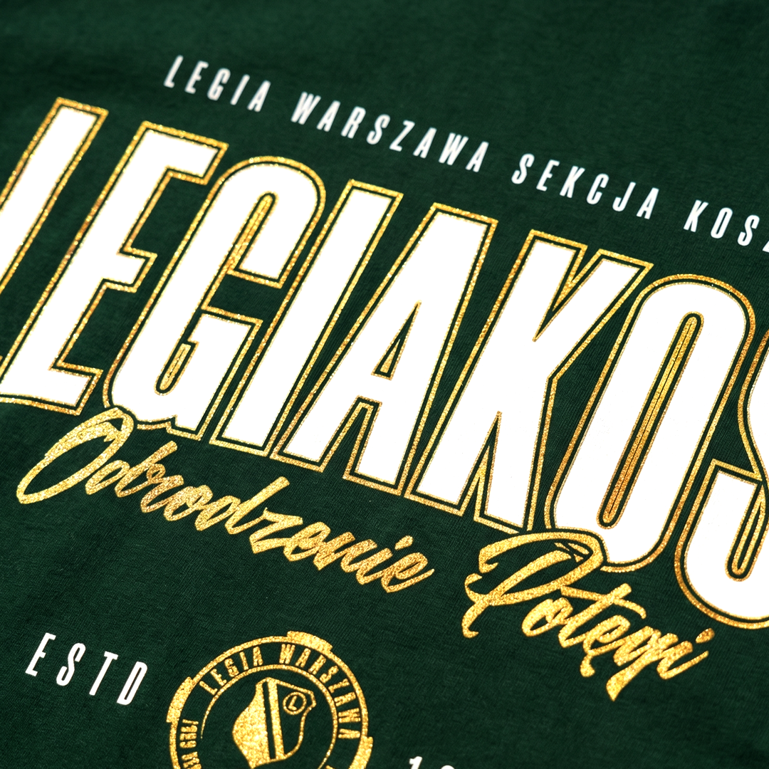 To koszulka z przesłaniem. Na piersi dumnie prezentuje się duży, biały napis „LEGIA KOSZ”, a pod nim złote hasło „Odrodzenie Potęgi”. Hasło “Odrodzenie Potęgi” zasługuje na wyjątkową oprawę. Złoty nadruk mieni się w słońcu, a białe elementy są trójwymiarowe, co daje świetny, nowoczesny efekt. To detale, które przyciągają wzrok. Całość uzupełnia herb i rok 1929 – symbol tradycji w nowoczesnym wydaniu.