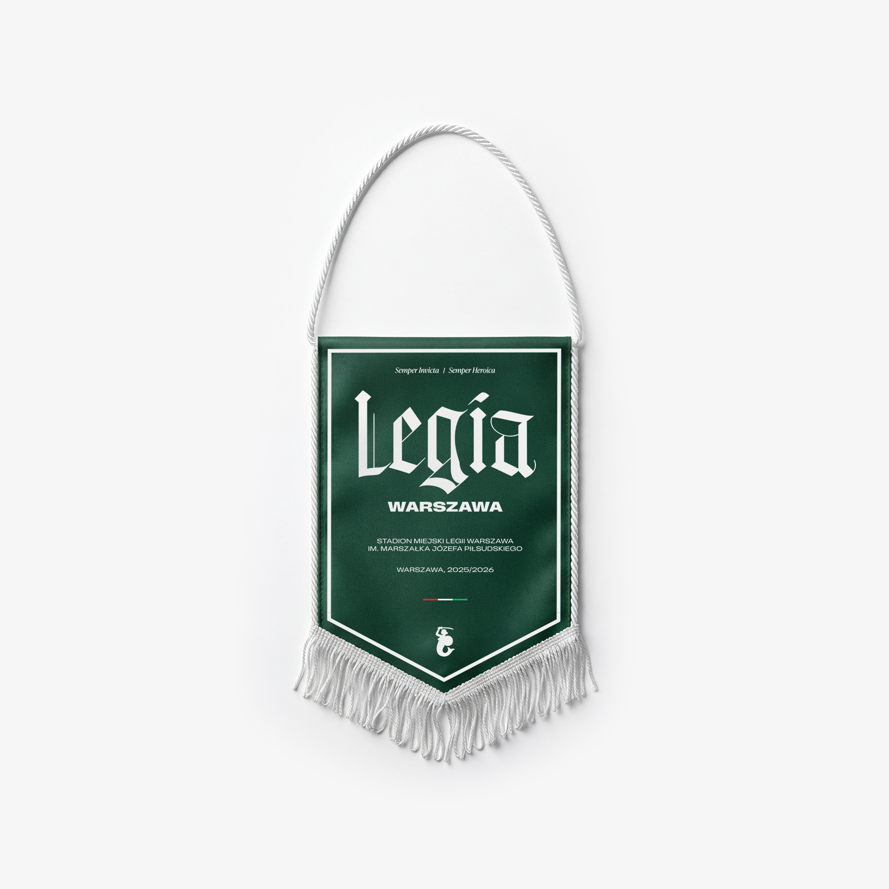 Strona A (Klasyczna elegancja): Głęboka zieleń z dumnym napisem „Legia Warszawa” wykonanym stylizowaną czcionką. Poniżej znajduje się pełna nazwa stadionu: Stadion Miejski Legii Warszawa im. Marszałka Józefa Piłsudskiego oraz herb Warszawy – Syrenka. Całość dopełnia łacińska sentencja Semper Invicta | Semper Heroica (Zawsze Niezwyciężona | Zawsze Bohaterska).