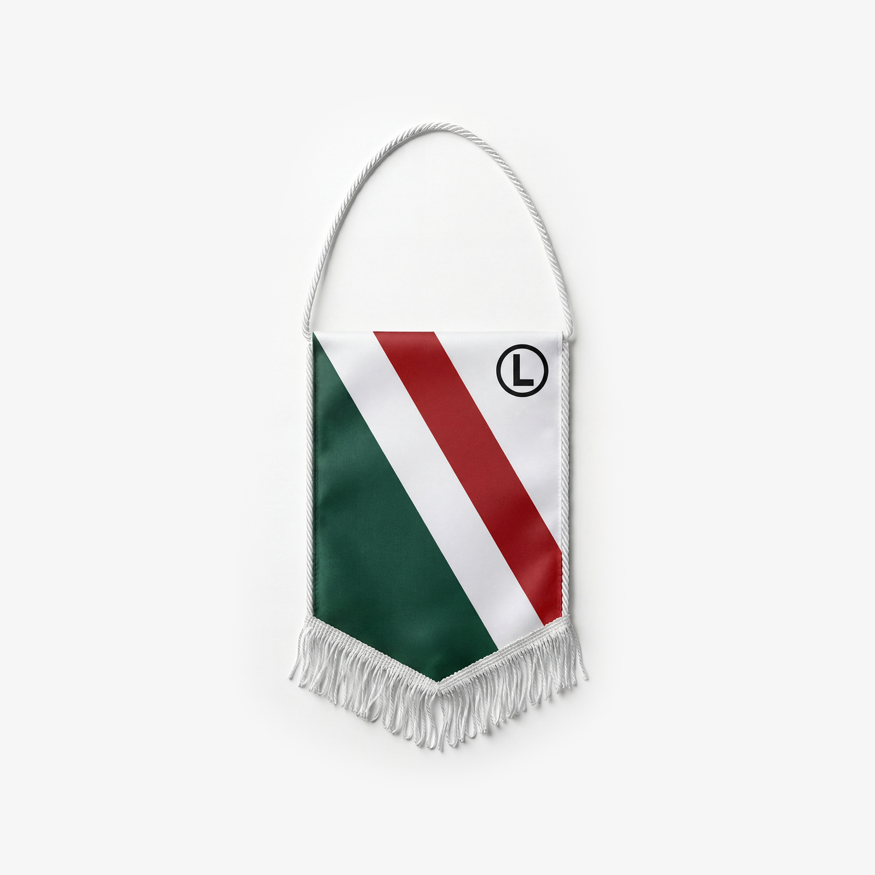 Strona B (Tradycyjne barwy): Dynamiczny układ ukośnych pasów w barwach klubu – białym, zielonym i czerwonym, z wyraźnym, ikonicznym symbolem „L” w kółeczku w prawym górnym rogu.