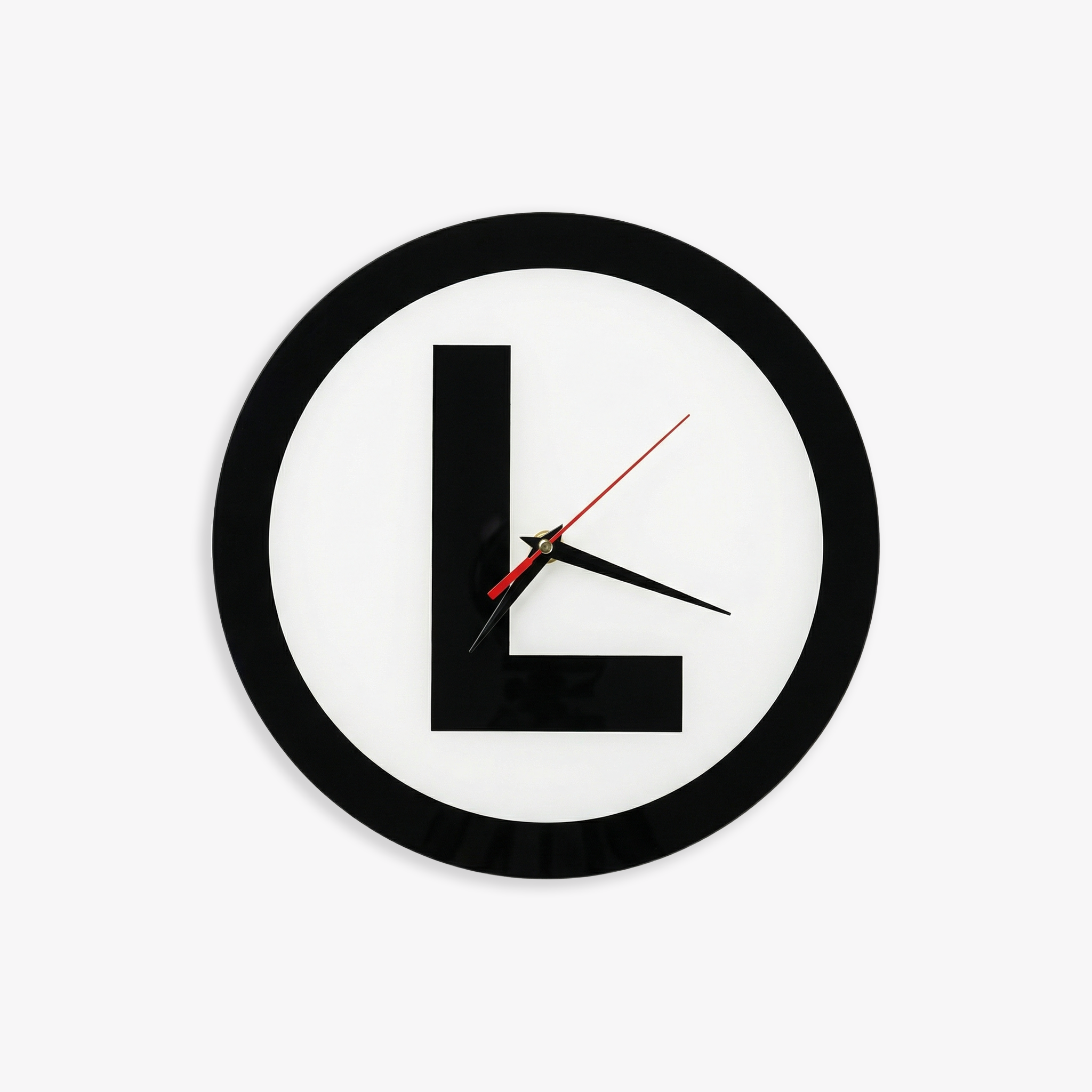 Zegar z eLką na tarczy. Średnica tarczy: 300 mm. Mechanizm kwarcowy ze skokowym ruchem sekundnika.