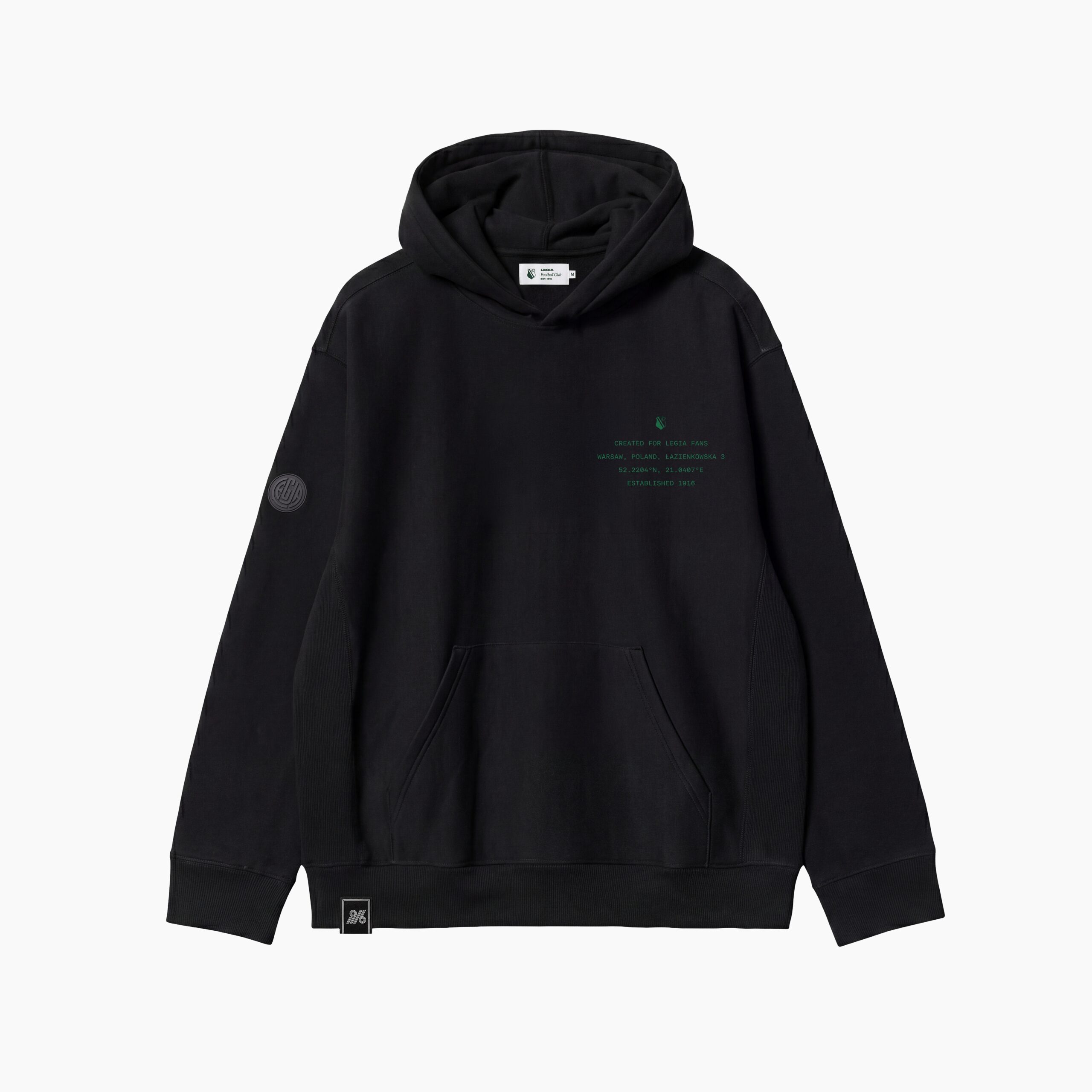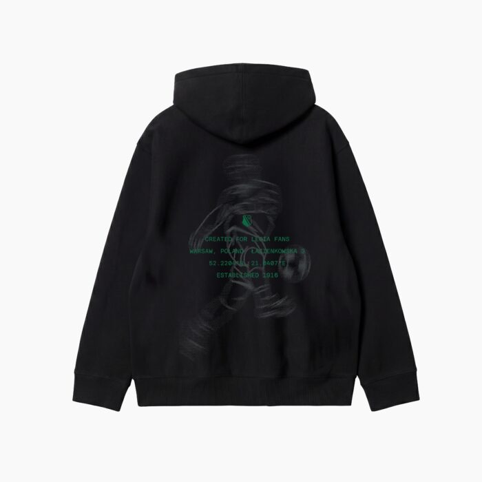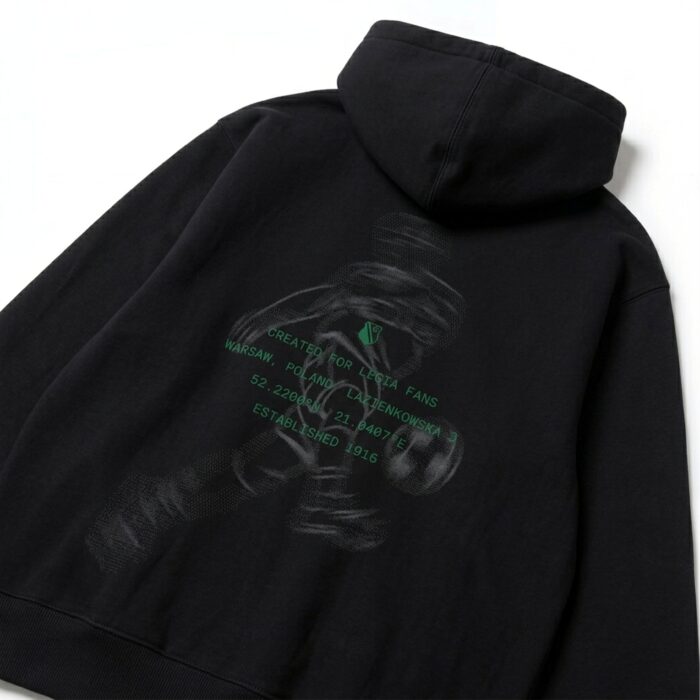 Pełen charakter bluzy ujawnia się na plecach. Umieszczona centralnie graficzna kompozycja w klubowej zieleni nawiązuje do Legii Warszawa i roku 1916. Warstwowy, lekko surowy styl nadruku buduje mocny wizualny akcent, który przyciąga uwagę, ale nie odbiera całości klasy. To historia pokazana odważnie, lecz z wyczuciem.