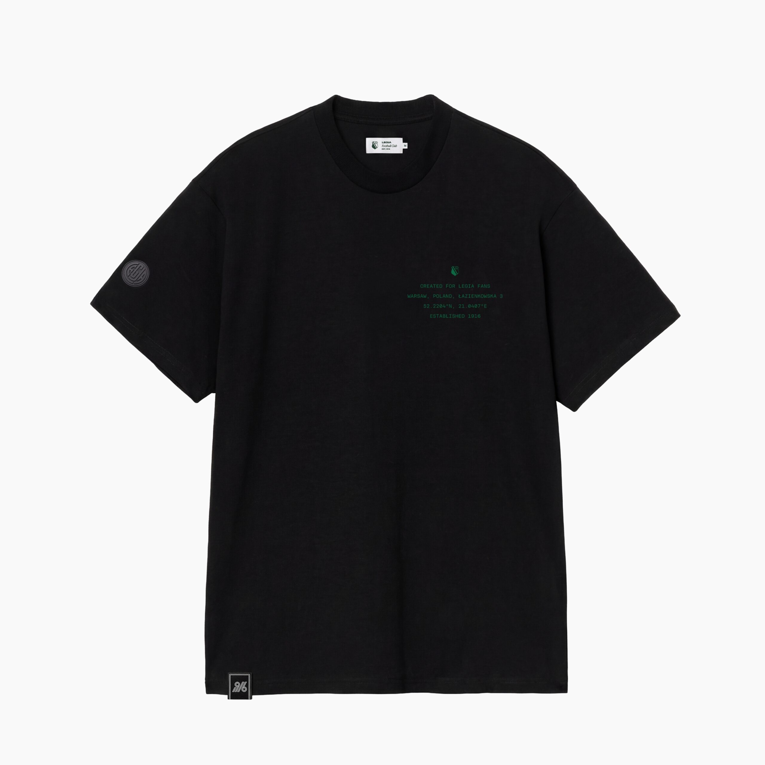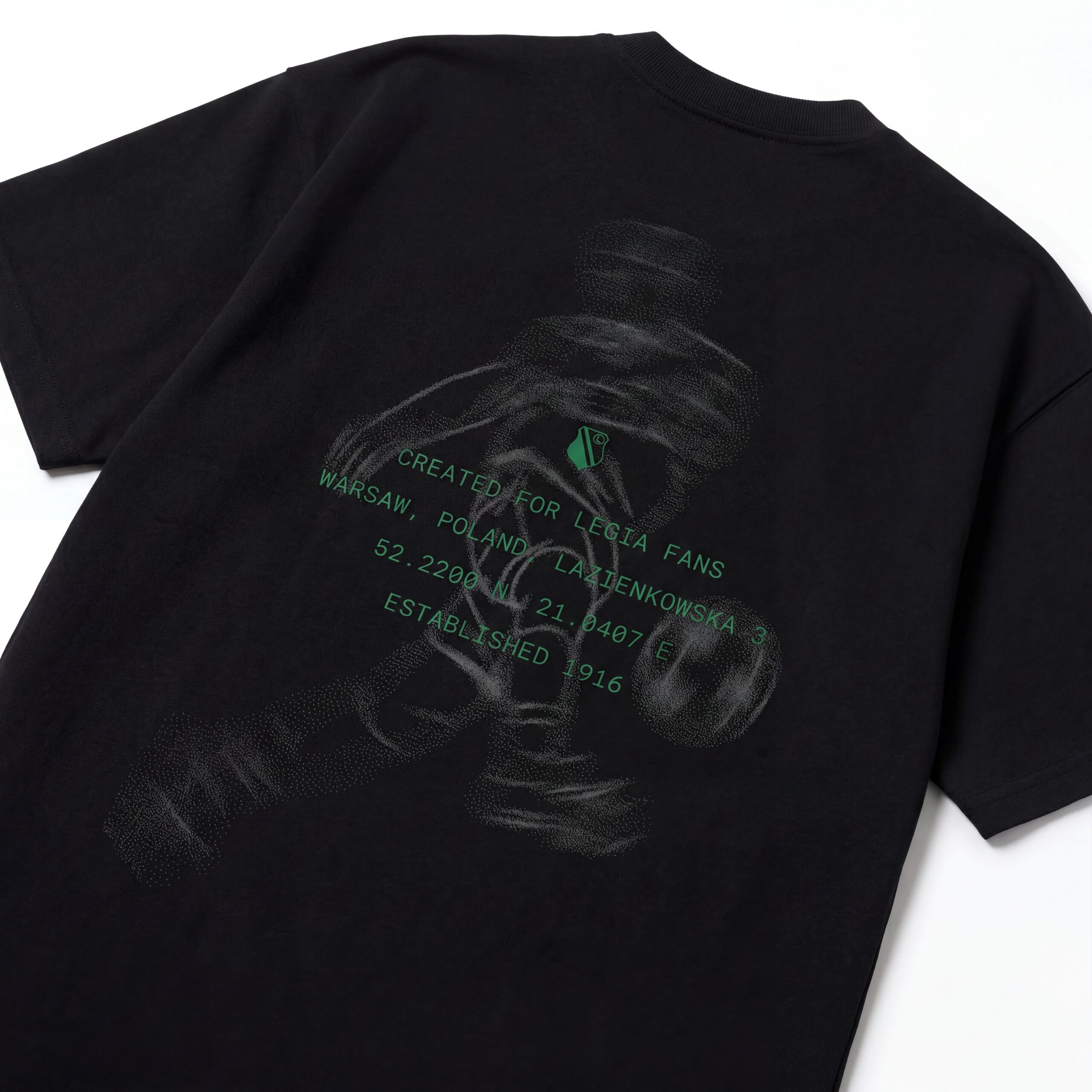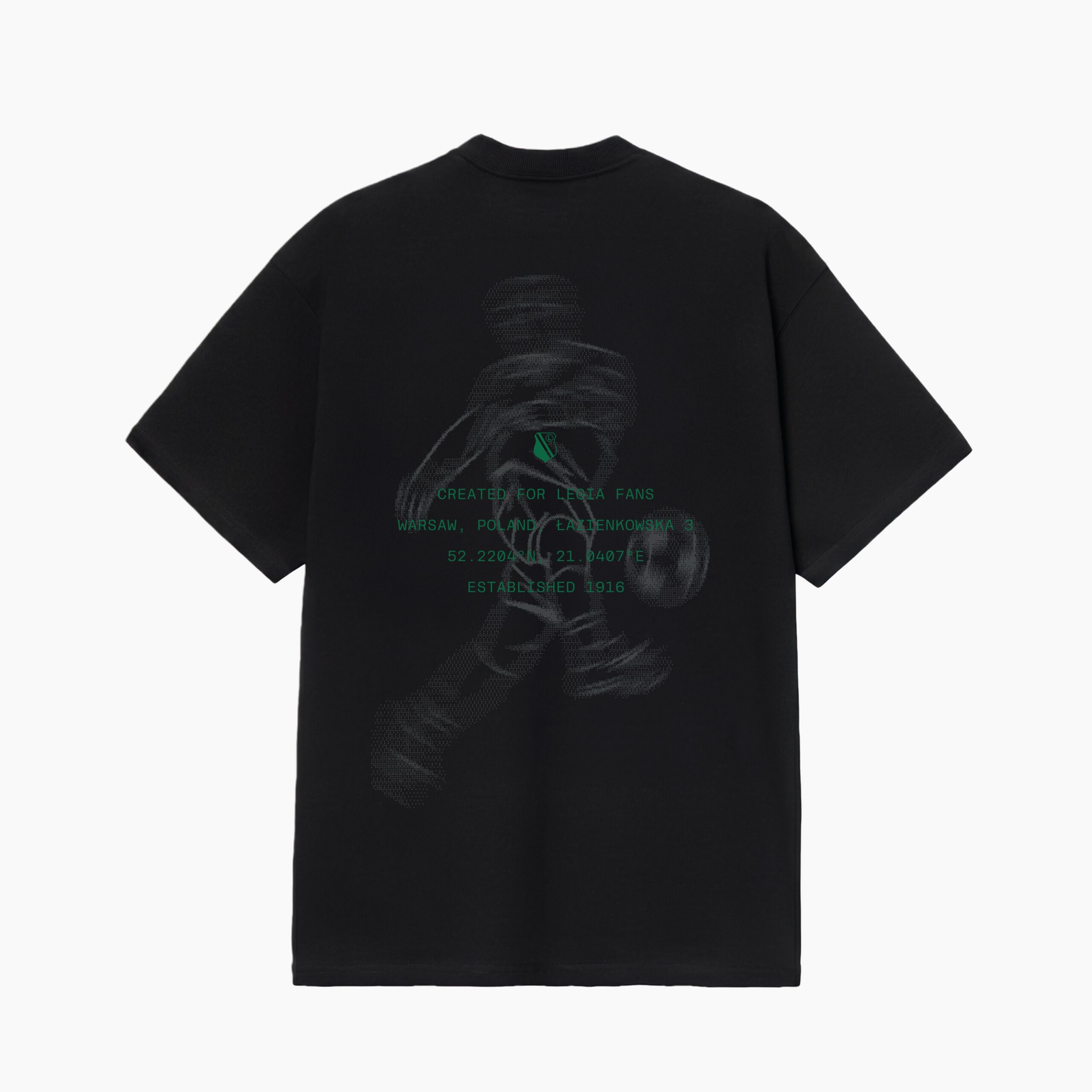 Prawdziwy charakter koszulki odkrywa się na plecach. Centralnie umieszczona grafika w klubowej zieleni nawiązuje do Legii Warszawa i roku 1916. Warstwowy, lekko surowy styl nadruku buduje mocny wizualny akcent, który przyciąga uwagę, nie odbierając koszulce elegancji. To historia opowiedziana obrazem.