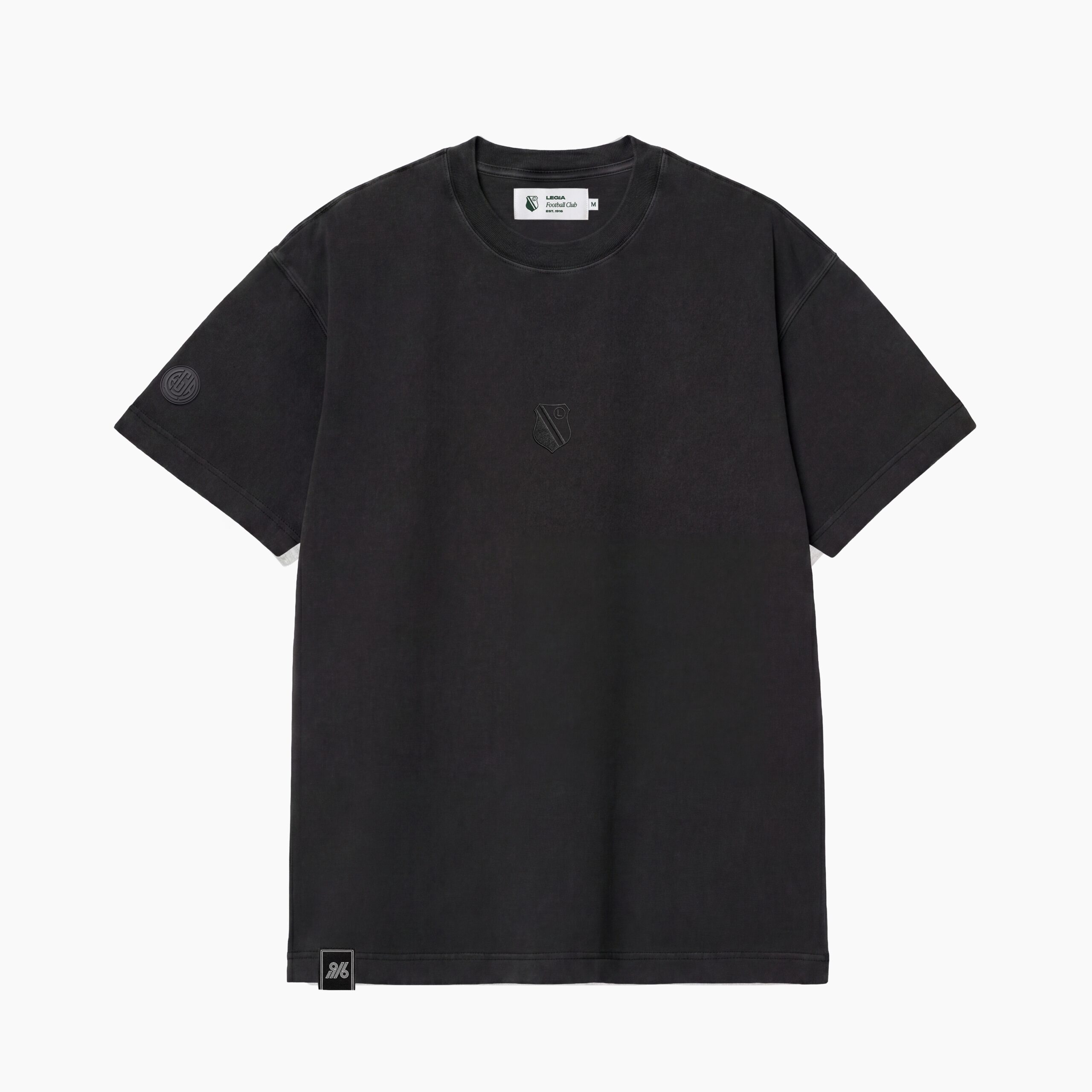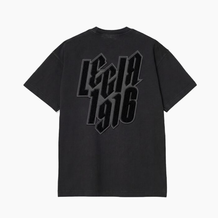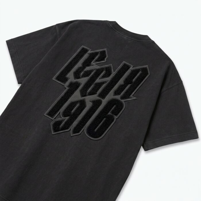 Tył koszulki to główny punkt projektu. Duży, czarny nadruk „Legia 1916” wykonany matową farbą tworzy efekt „grafit na czerni”. Wyrazista, nowoczesna typografia przyciąga uwagę, ale pozostaje spójna z minimalistyczną estetyką kolekcji. To mocny znak klubowej tożsamości podany w spokojnej formie.