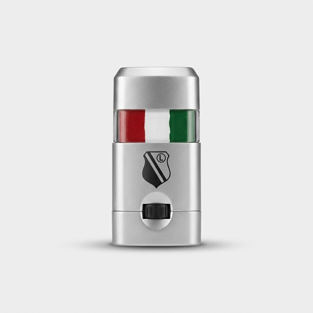 Herb Legii: Na obudowie znajduje się klasyczna “eLka” w kółeczku na tarczy – symbol, który zna każdy kibic.