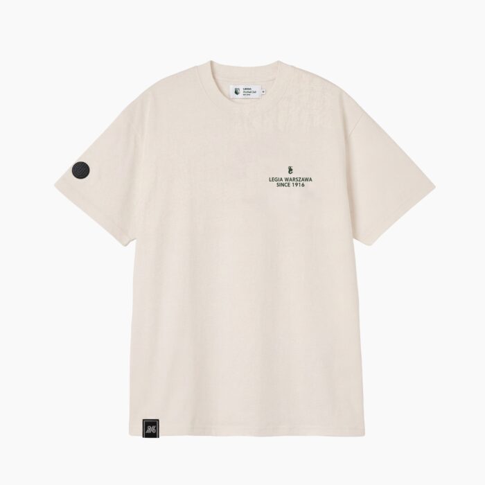 Na lewej piersi znajduje się niewielki, zielony nadruk „Legia Warszawa” z klubowym motywem. Jest dyskretny i nienachalny, idealnie wpisując się w minimalistyczny charakter koszulki. Przód pozostaje czysty i uniwersalny — sprawdzi się także poza stadionem.