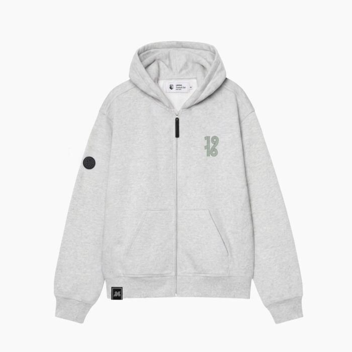 Przód bluzy pozostaje oszczędny w formie. Na lewej piersi umieszczony został niewielki, zielony motyw „1916”, wykonany w klubowej stylistyce. To dyskretny detal, który nie dominuje całości. Pełny zamek zapewnia wygodę noszenia i pozwala łatwo dopasować bluzę do warunków – na zewnątrz i wewnątrz.