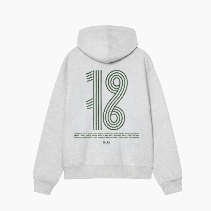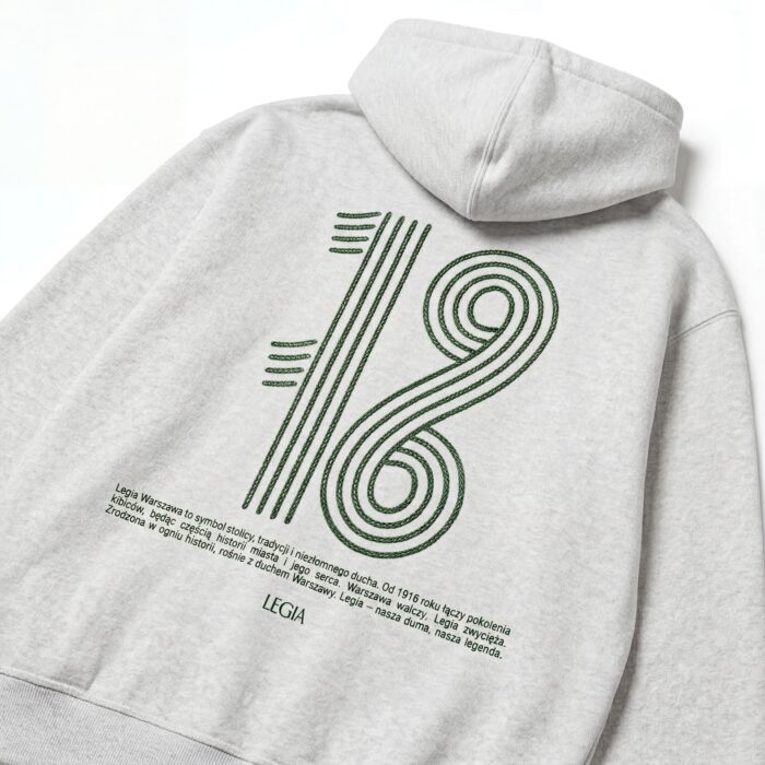 Głównym elementem projektu jest tył bluzy. Duży nadruk „1916” w charakterystycznej, konturowej typografii przyciąga uwagę, zachowując przy tym lekkość i nowoczesny charakter. Zielony kolor kontrastuje z jasnym melanżem, a całość tworzy czytelny, klubowy akcent bez nadmiaru.