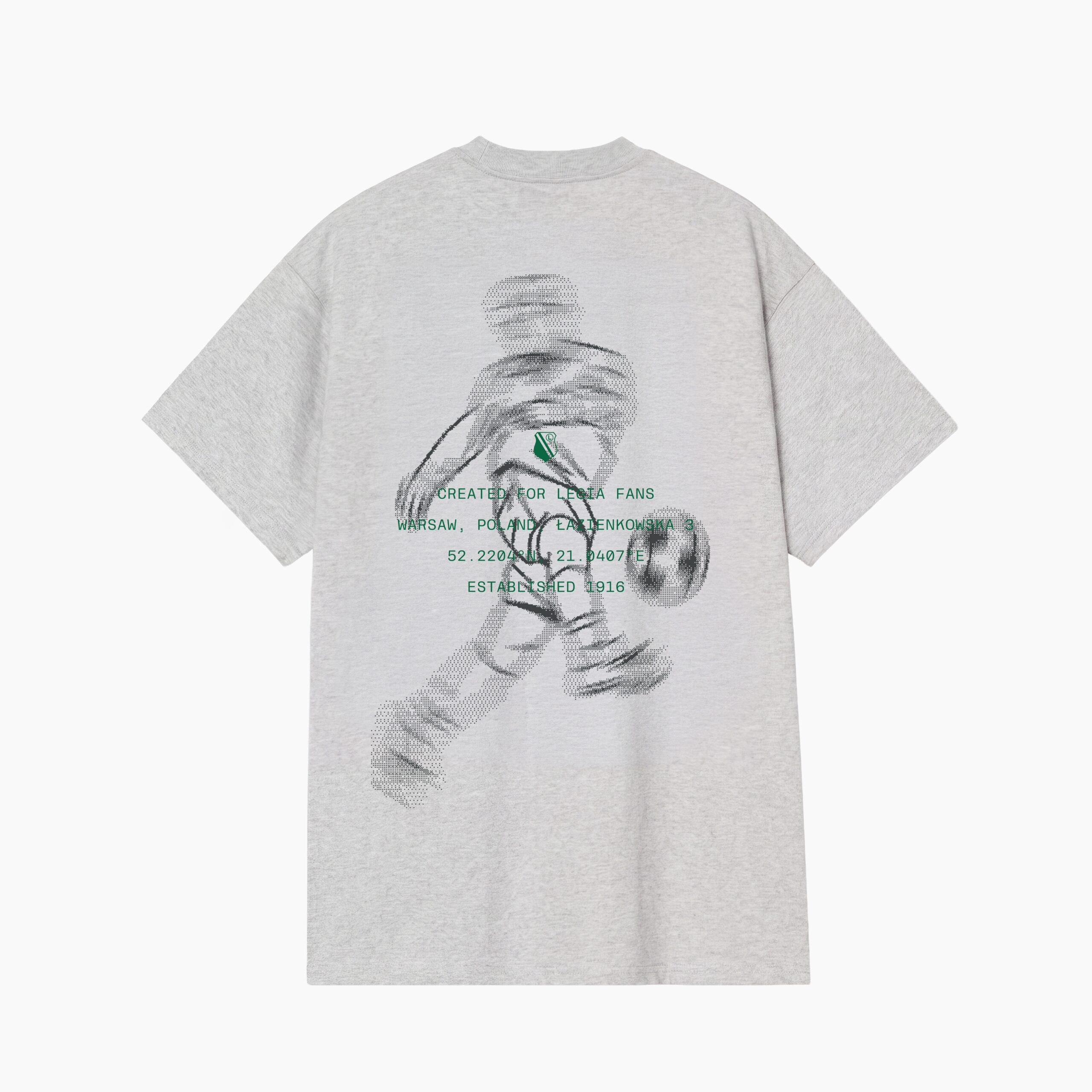 Pełny charakter koszulki ujawnia się na plecach. Umieszczony centralnie nadruk „1916” nawiązuje do roku założenia Legii Warszawa. Jasna grafika kontrastuje z szarym melanżem, pozostając czytelna i wyrazista, ale wciąż elegancka. To klubowy akcent, który przyciąga wzrok bez narzucania się.