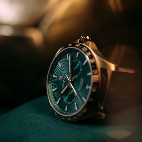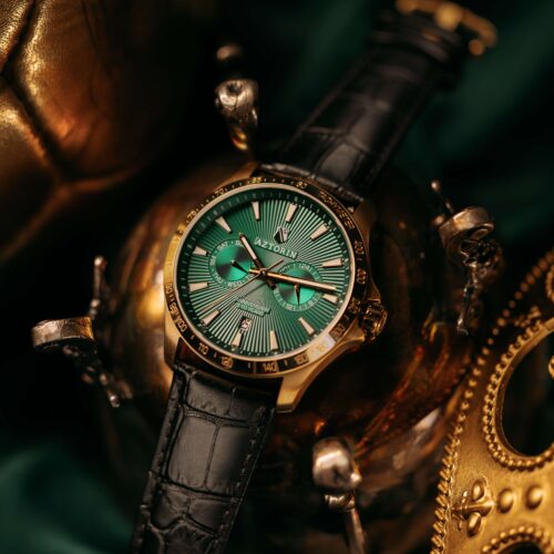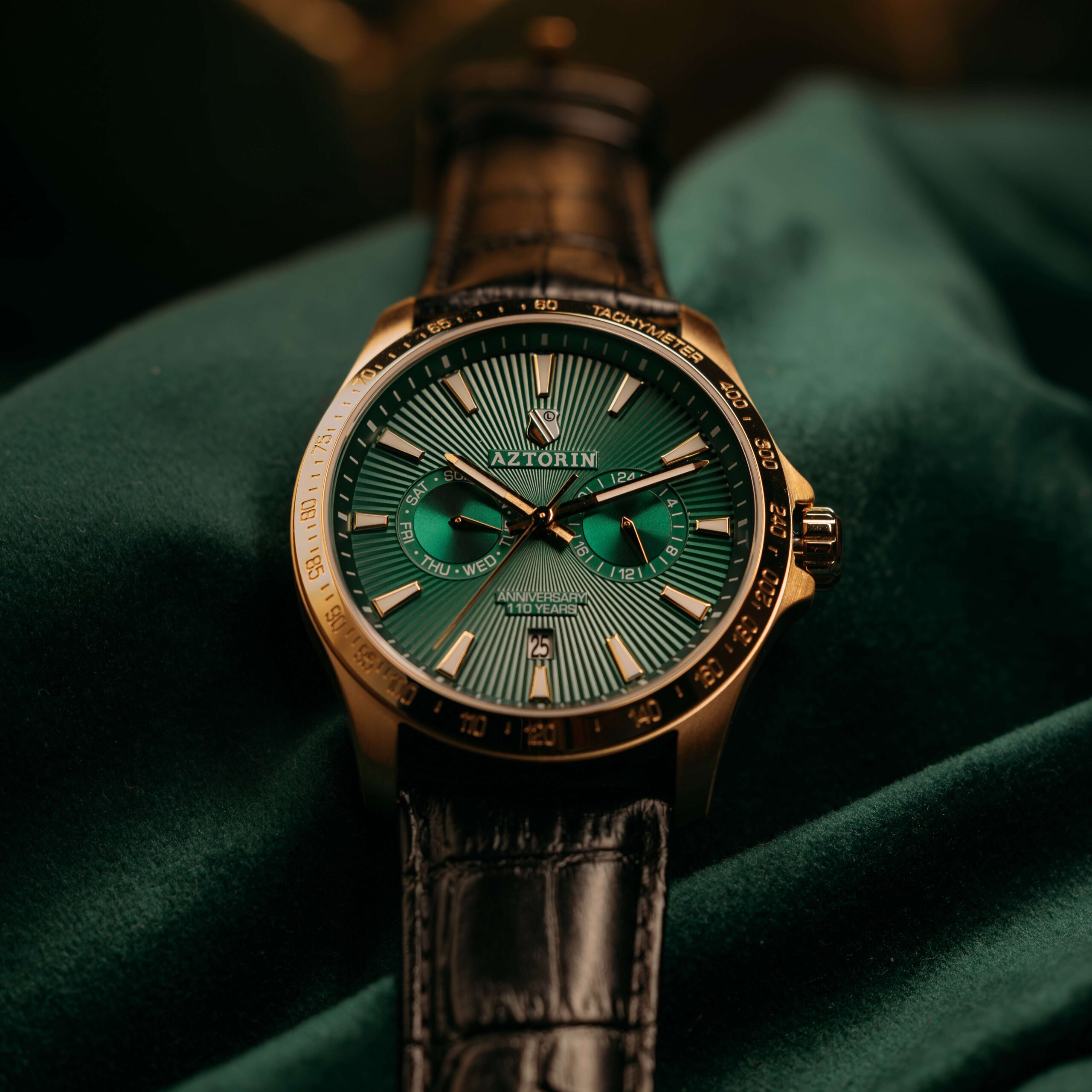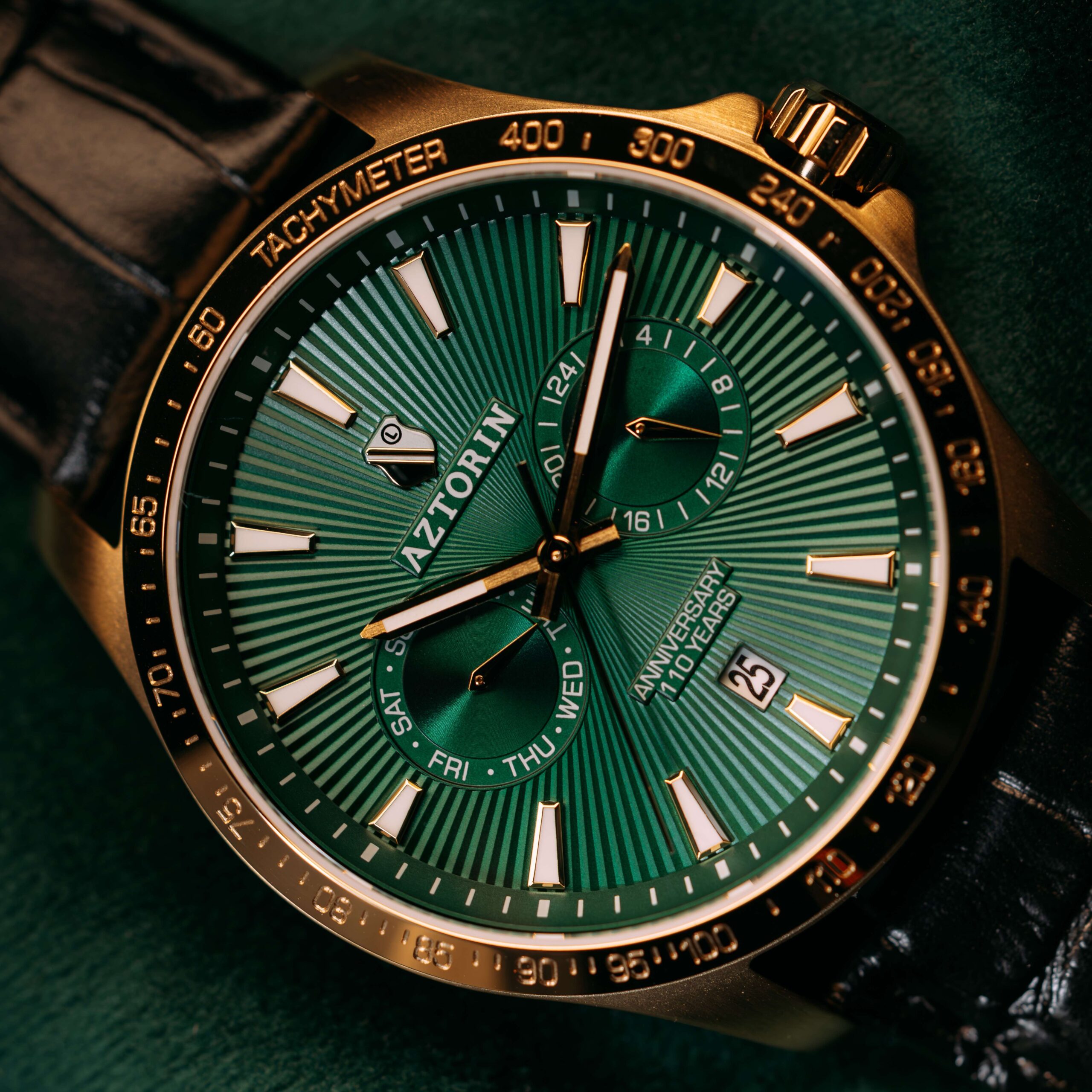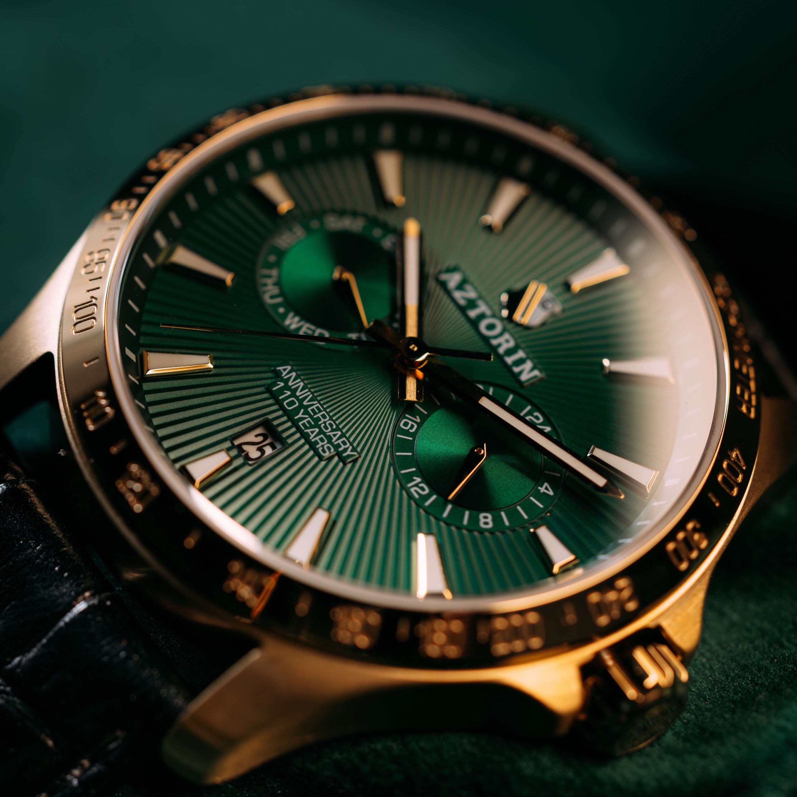Elegancka odsłona jubileuszowego zegarka marki Aztorin, zaprojektowana dla kibiców ceniących prestiżowe połączenie barw. Ten model z kolekcji Sport celebruje 110. rocznicę powstania Legii Warszawa (1916–2026), zestawiając klubową zieleń ze szlachetnym złotem oraz klasyczną czernią.