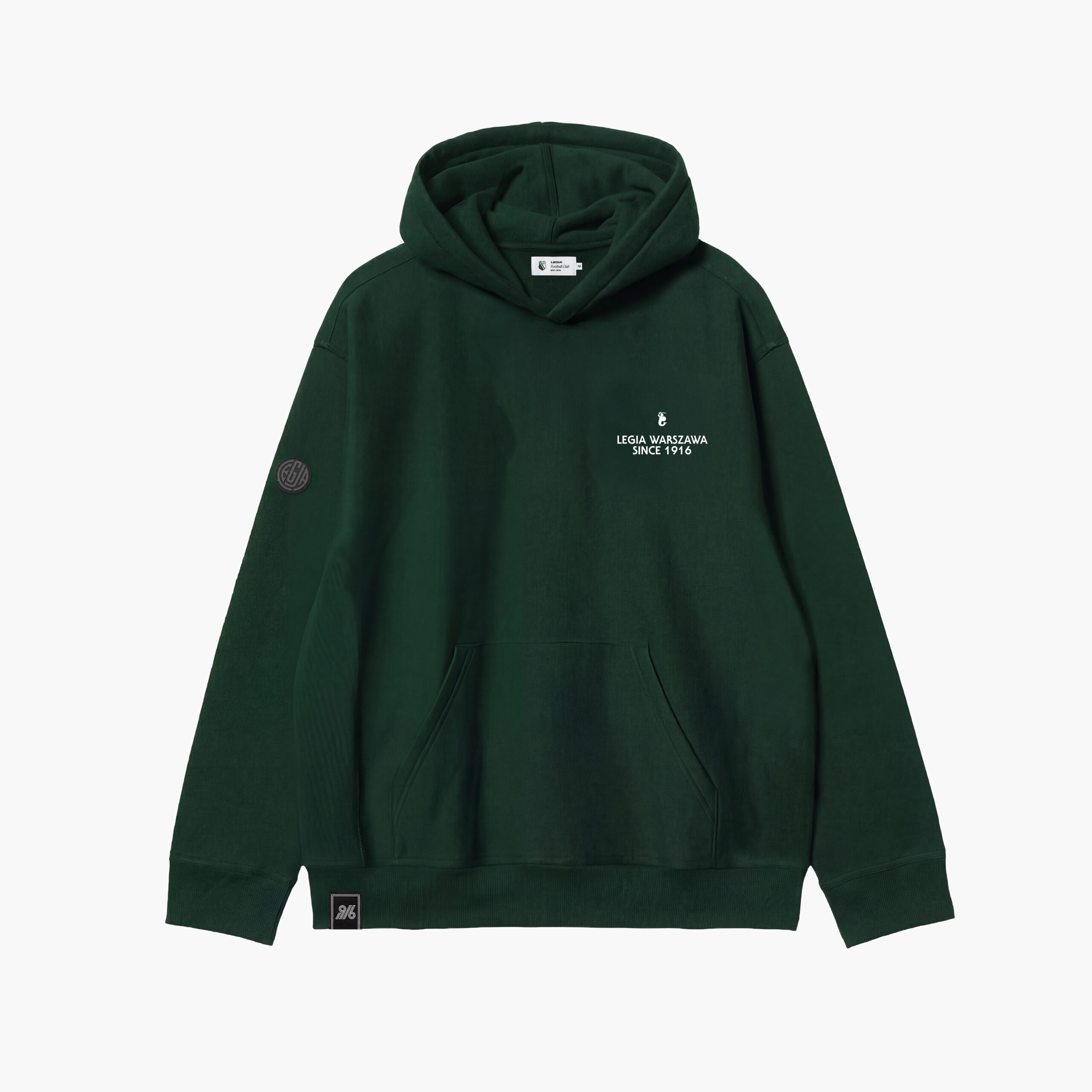 Na lewej piersi znajduje się niewielki, jasny nadruk „Legia Warszawa”. Subtelny, spokojny i dobrze widoczny na ciemnozielonym tle. Przód bluzy pozostaje czysty i neutralny, dzięki czemu całość świetnie sprawdza się w miejskich stylizacjach – także poza stadionem.
