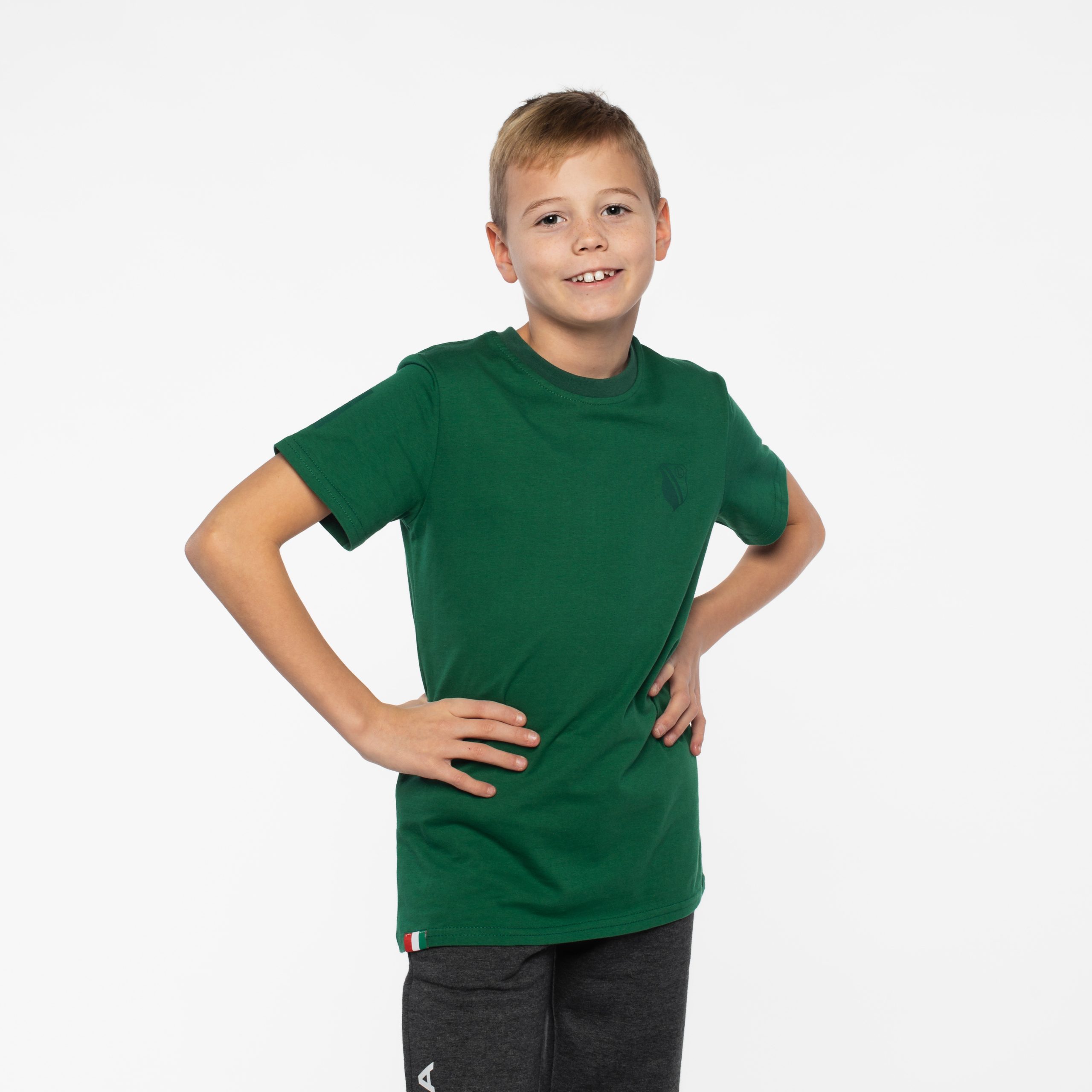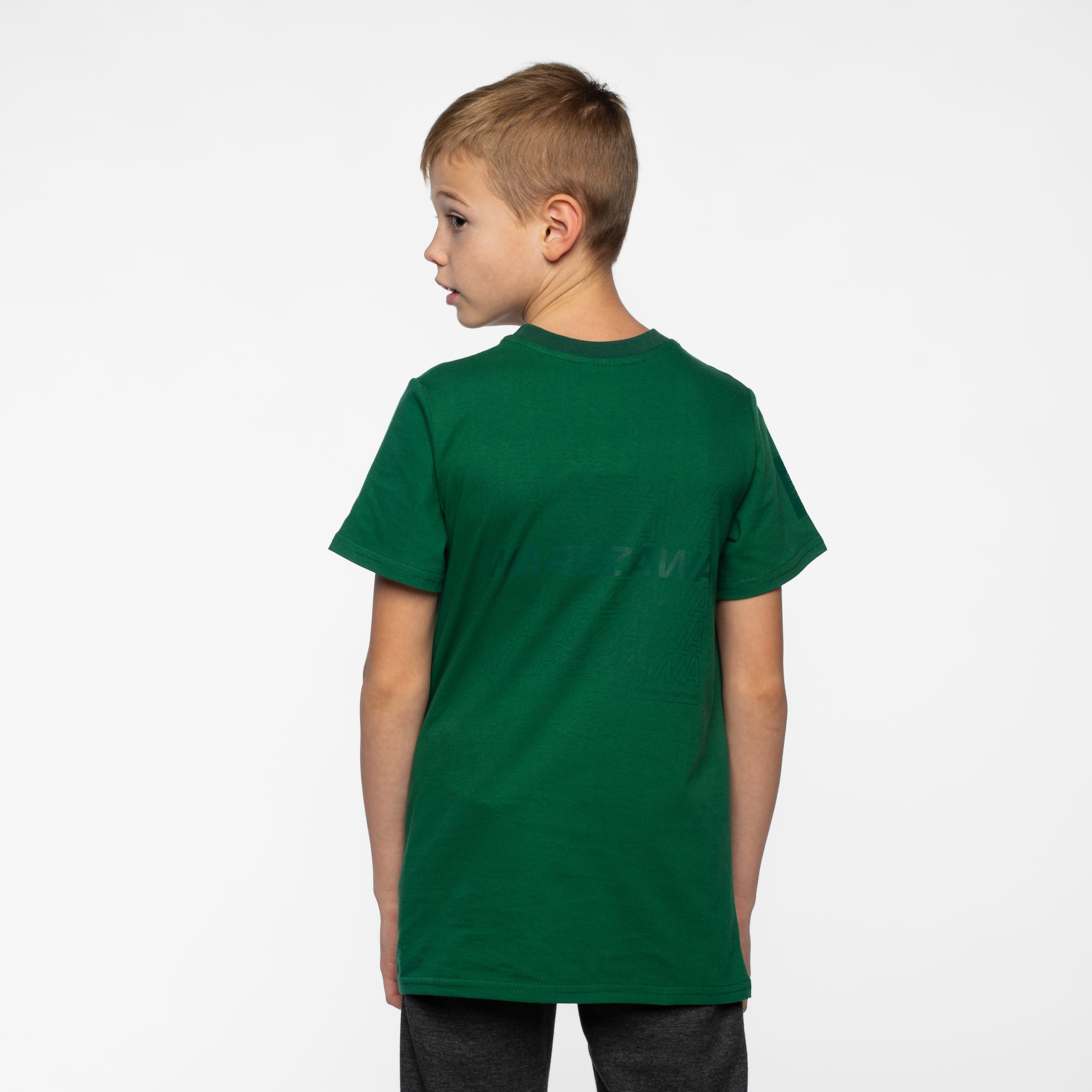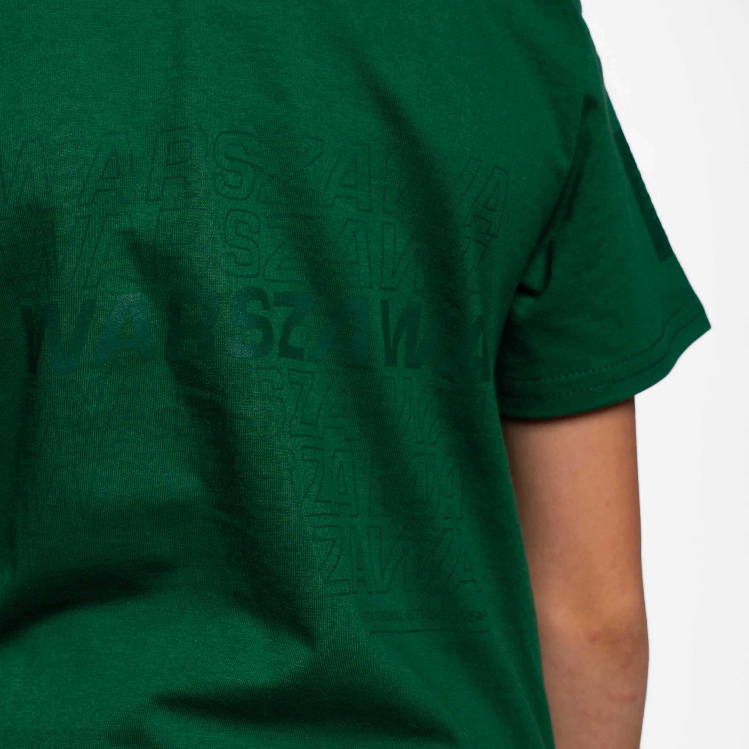 Zielona koszulka dziecięca z Herbem Legii Warszawa oraz dużą grafią na plecach prezentującą nazwę stolicy Polski. Na rękawku nazwa klubu Legia Warszawa.