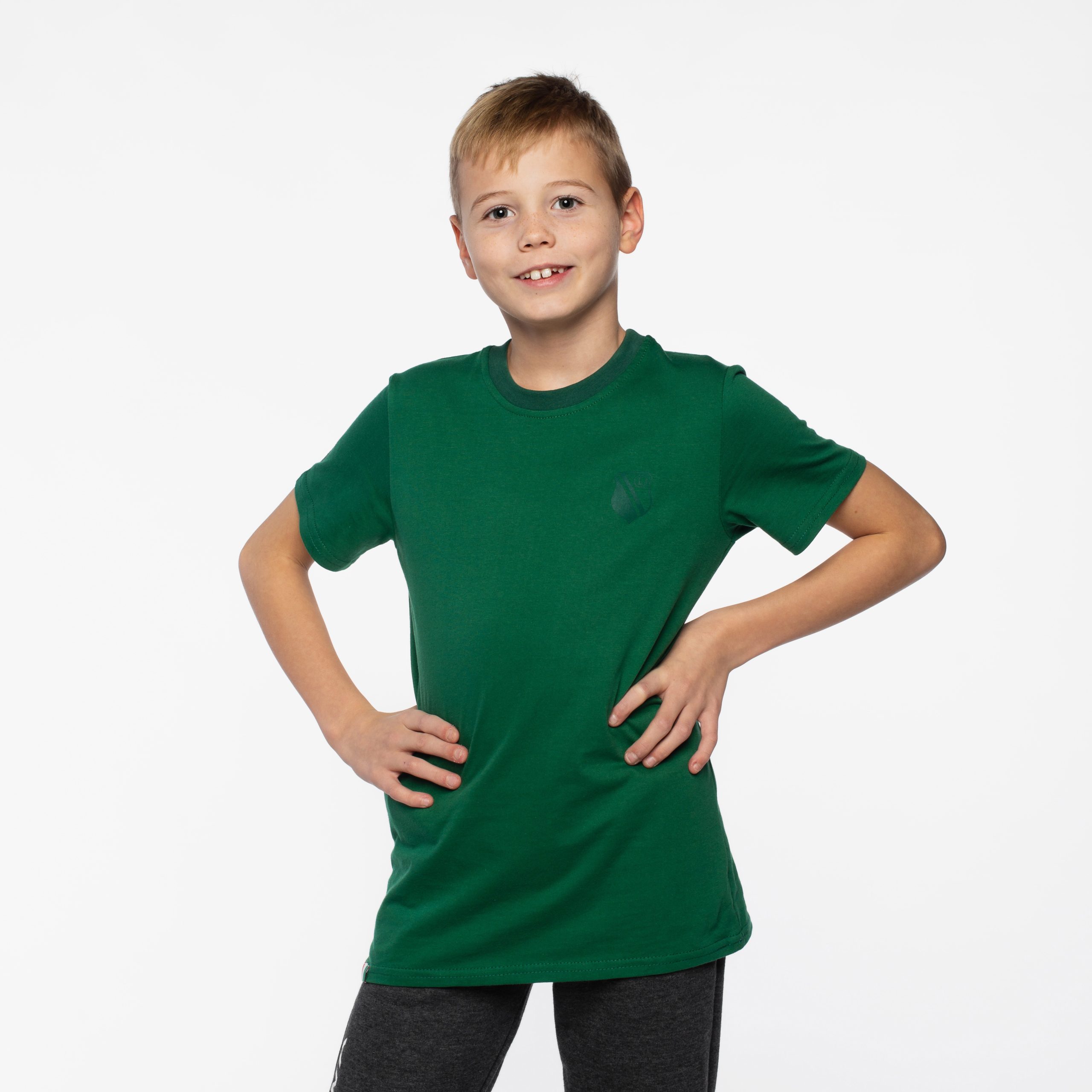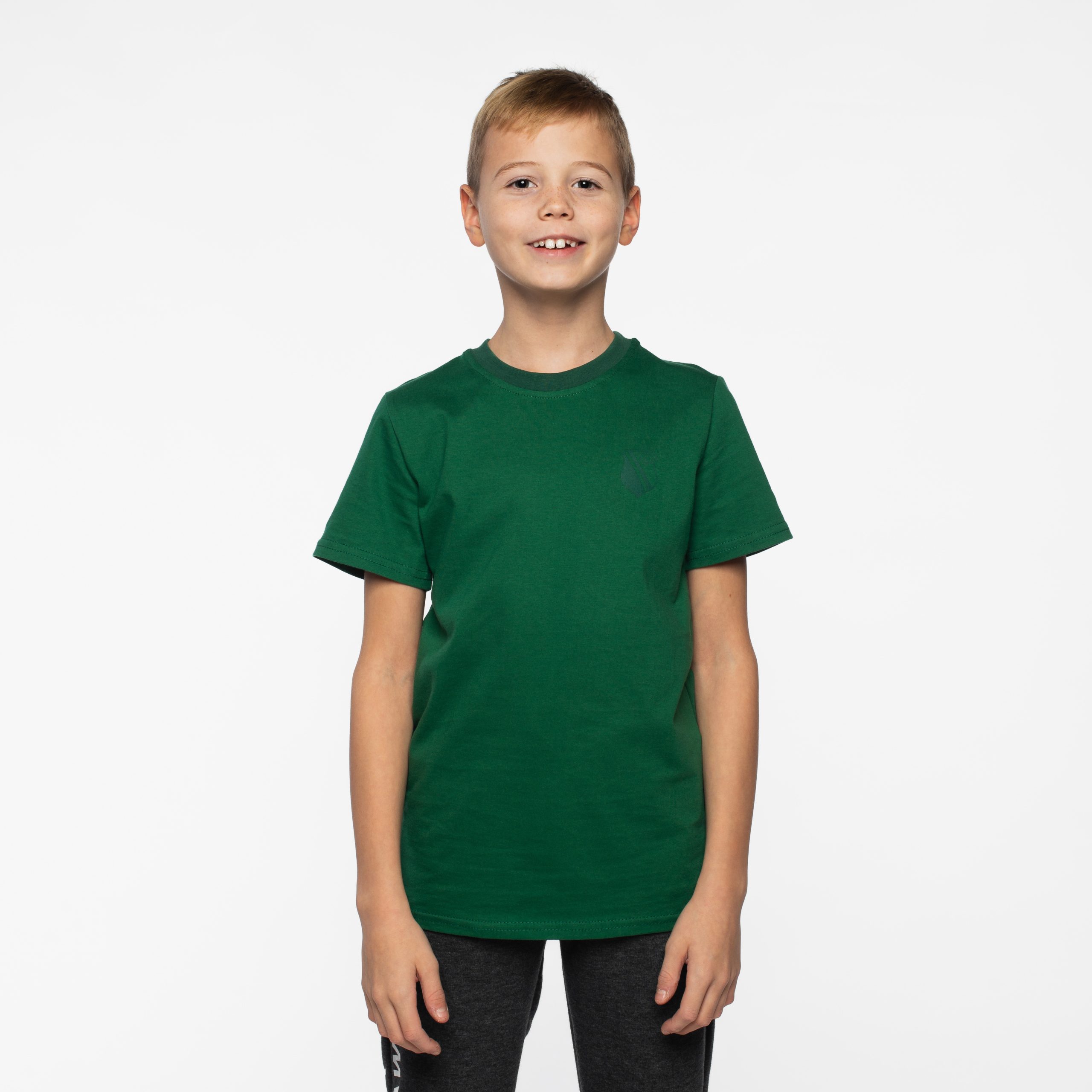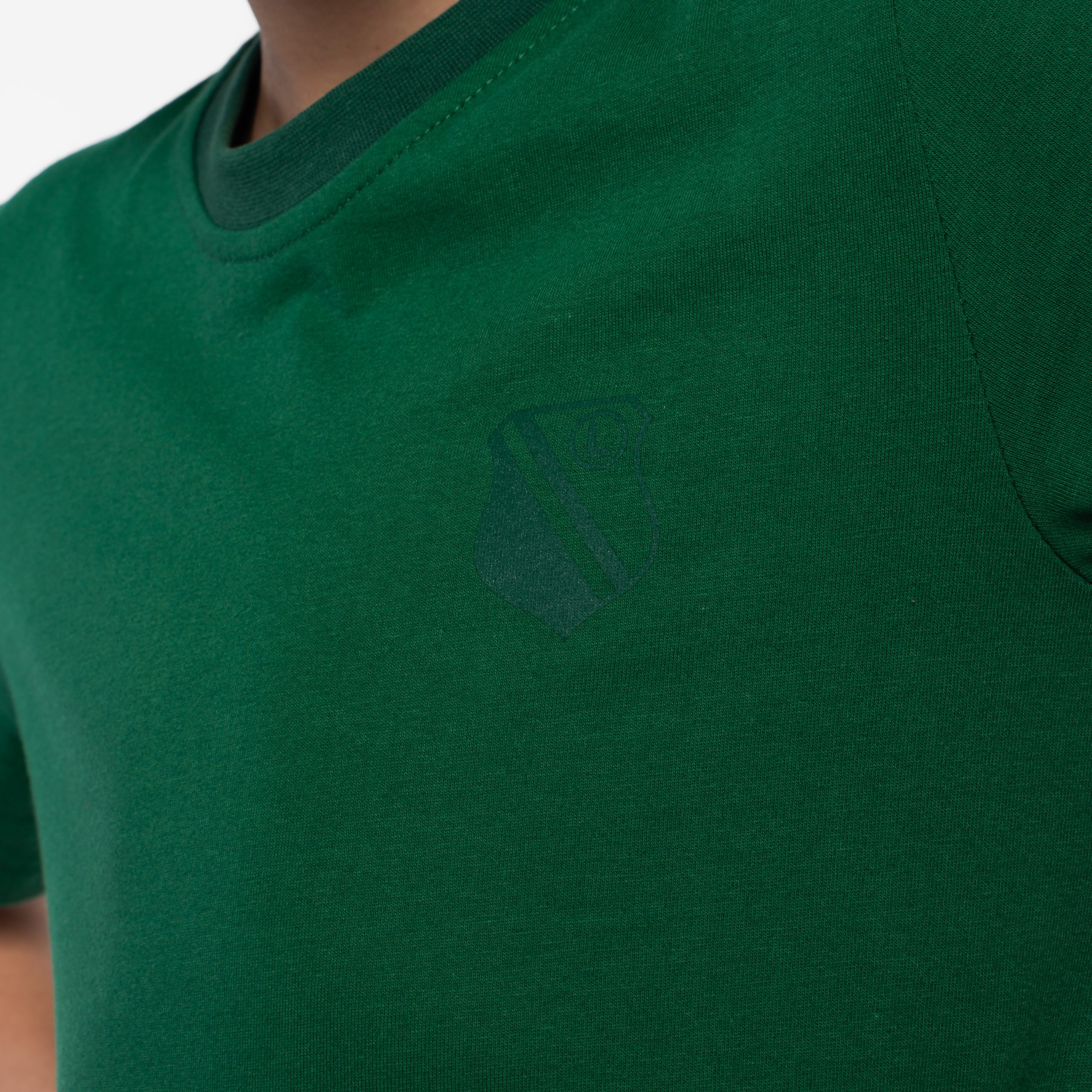 Zielona koszulka dziecięca z Herbem Legii Warszawa oraz dużą grafią na plecach prezentującą nazwę stolicy Polski. Na rękawku nazwa klubu Legia Warszawa.